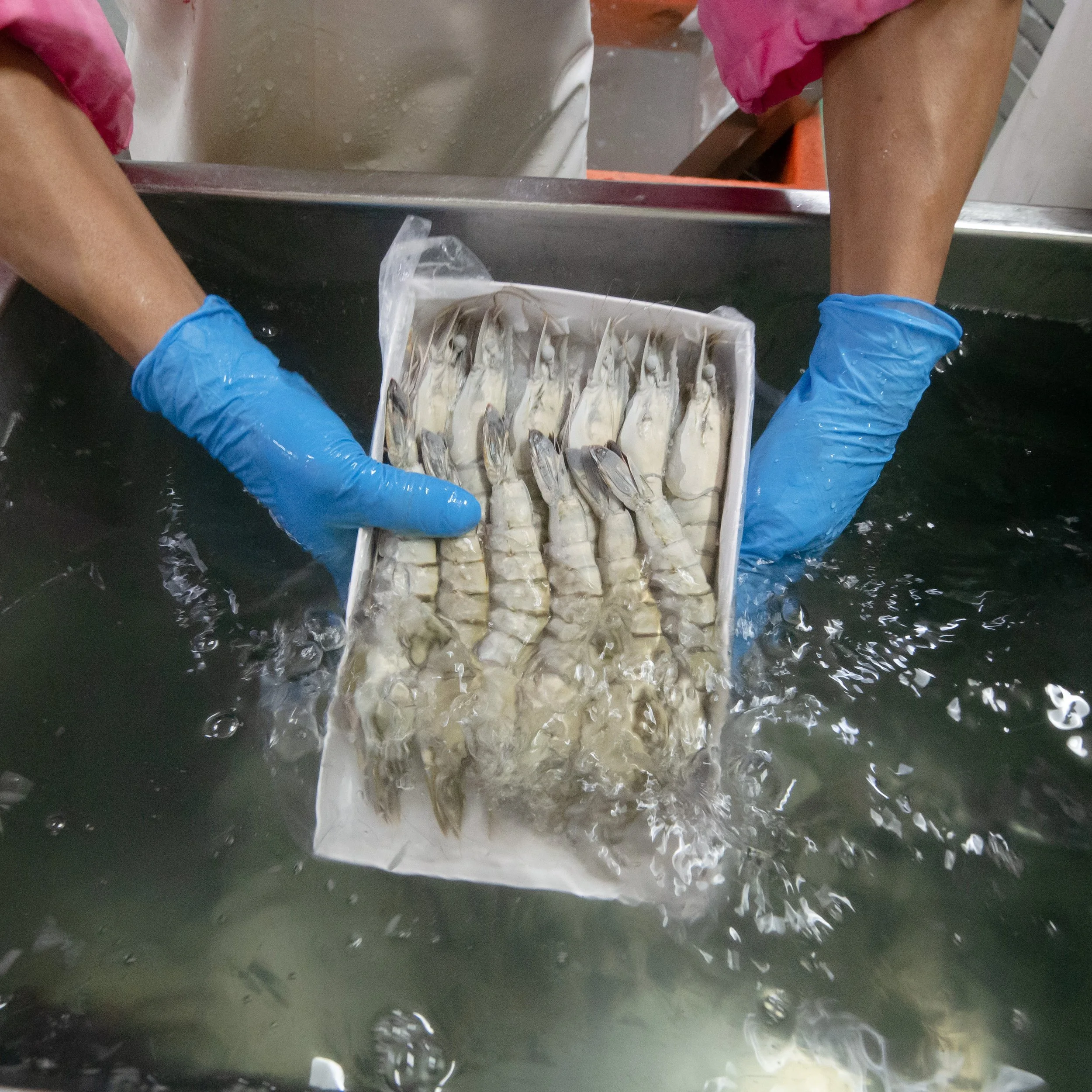 A final glazing step, involving a quick dip in filtered water, forms a thin layer of ice that protects against air exposure and freezer burn, helping the prawns retain their texture, flavour, and appearance.